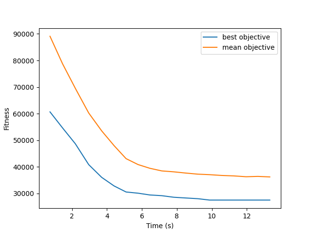 We ran our algorithm several times on the smallest benchmark problem: \(\textit{tour29}\). Figure 1 shows a convergence graph of one of the generally better outcomes of our algorithm. This simulation needed 13.31 seconds to reach convergence. The algorithm ends with a best objective value of 27510.73. This is not the global optimum, since we have encountered some slightly lower fitness values during the parameter selection phase. As we run the algorithm multiple times, we conclude that there is some variation to the final solution after the algorithm reaches convergence, this is shown in figure Figure 2 in which we ran the algorithm ten times. The problem with the algorithm is that it is not deterministic and it can get stuck in an local optimum. Nevertheless, the average fitness value in which the algorithm usually converges is relatively close to the global optimum.